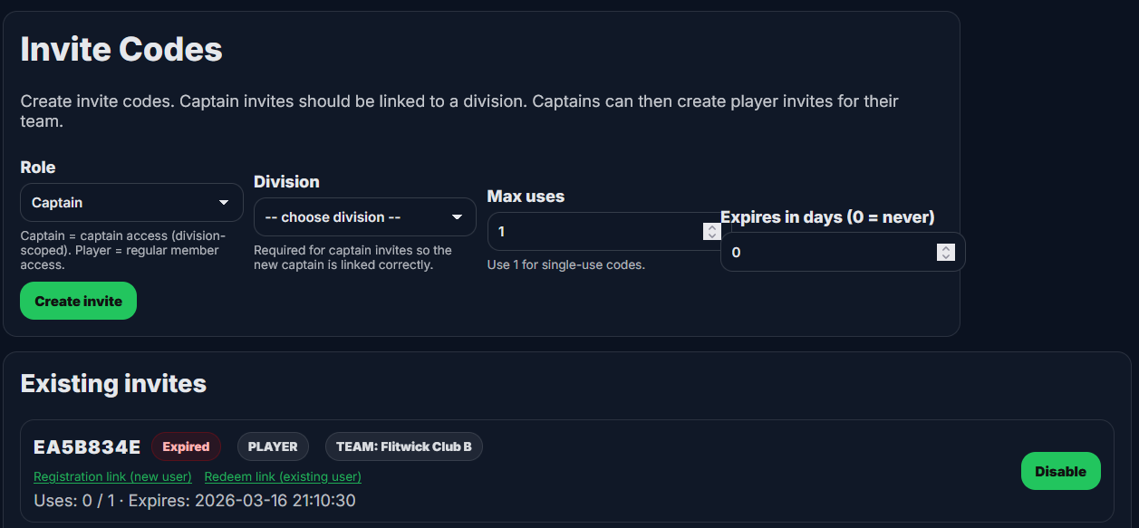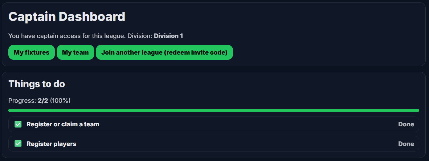 A good workflow is to get the structure ready first, then invite captains once divisions and teams are in place.