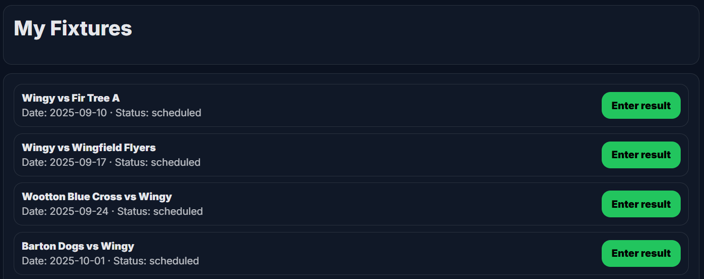 On match night, captains should start from the Fixtures page, open the correct fixture, then complete the result card. The live scoreboard can be used for each game if wanted.
