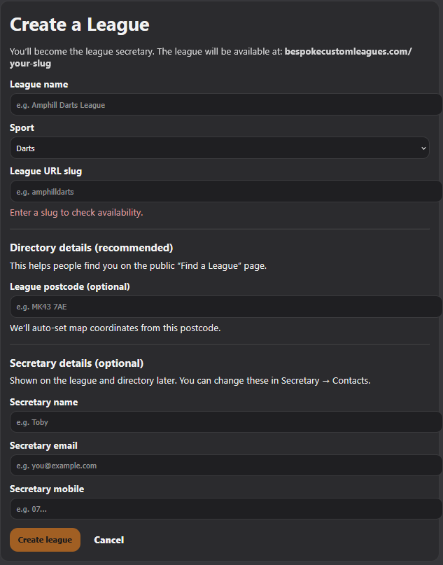 Once the Secretary is registered, the next step is to set up the league ready for the season.