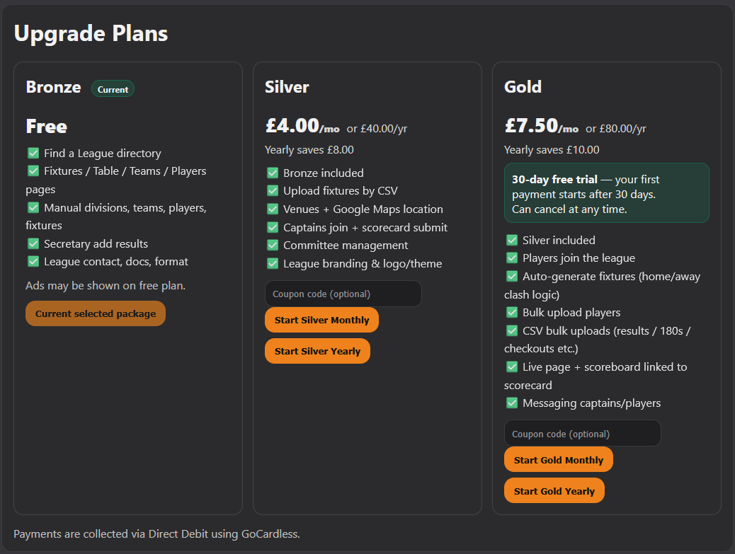 Start on Bronze for free or choose Silver / Gold if you want extra setup tools, captain access and live match-night features.