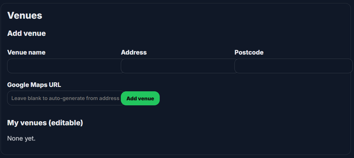 Captains can also add and edit venues they created, including address, postcode and Google Maps URL.